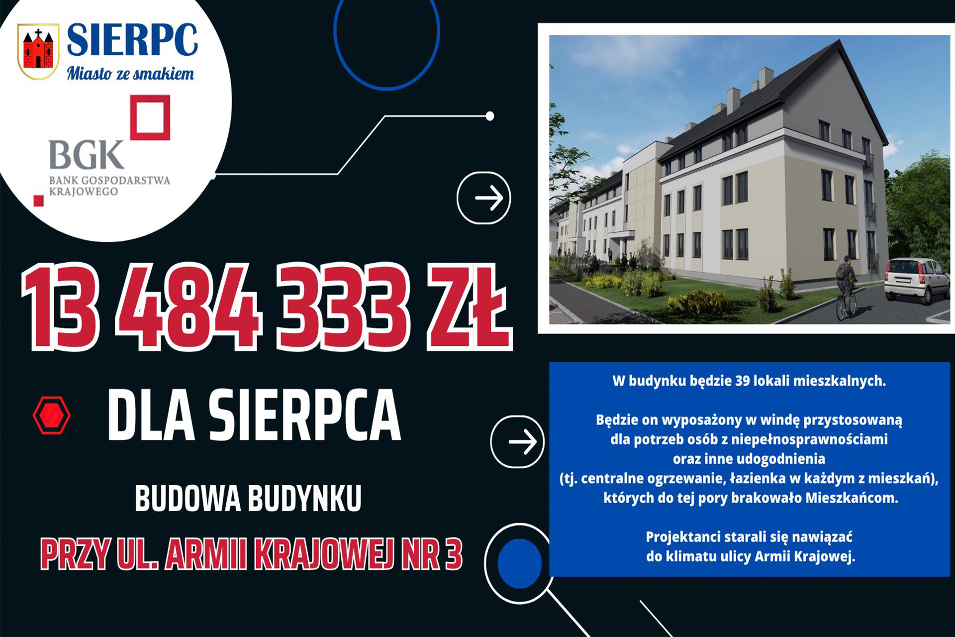 Bank Gospodarstwa Krajowego pozytywnie rozpatrzył wniosek miasta o udzielenie wsparcia finansowego z Funduszu Dopłat na budowę budynku wielorodzinnego przy ul. Armii Krajowej 3 w wysokości 13 484 333 zł. W budynku będzie zagospodarowanych 39 lokali mieszkalnych.